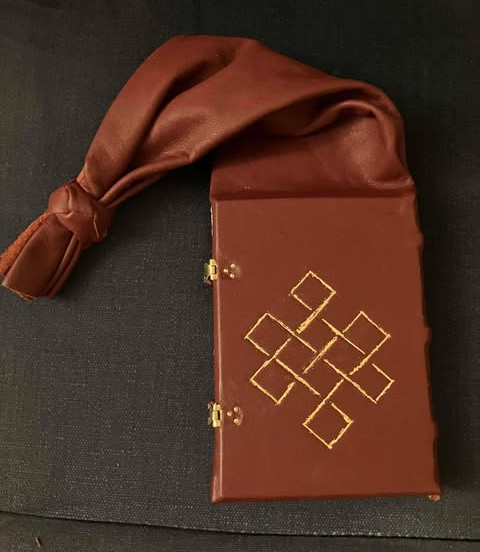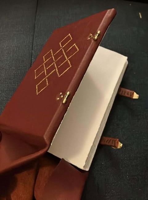 In 2025 I made a girdlebook as a Cordon Rouge token. Girdlebooks are designed with a tail so they can hang from one's belt. This has a bit of an attempt at gold leaf applied with hot tools.